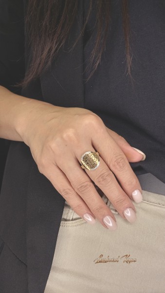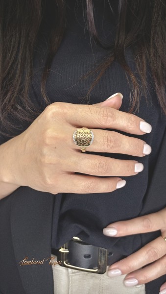 Front pierścionka ażurowy ozdobiony cyrkoniami.Obrączka zdobiona plecionką.