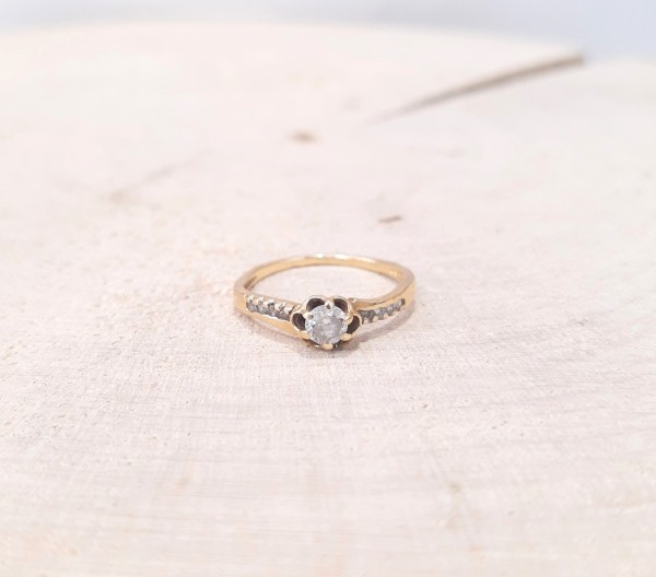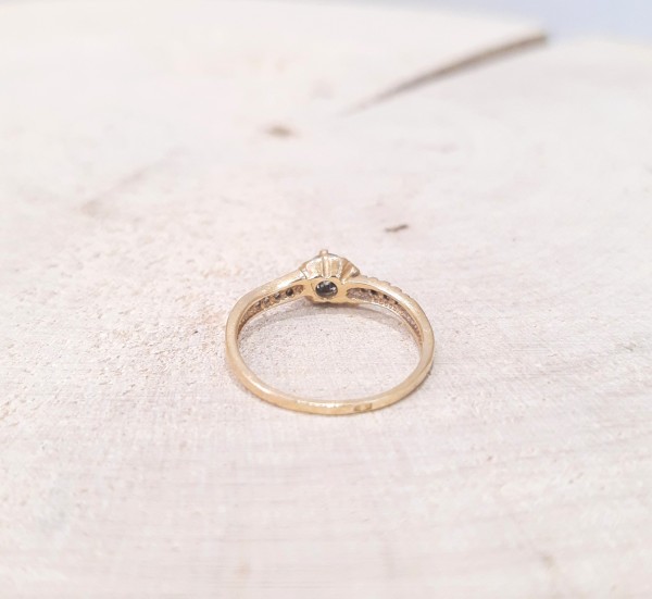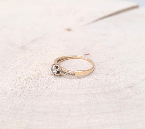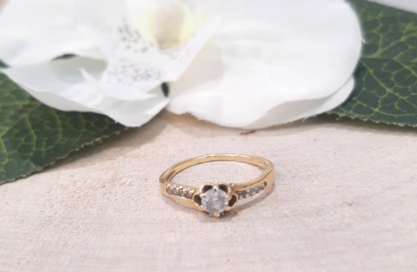 Przedmiotem sprzedaży jest pierścionek z cyrkoniami, wykonany z 14-karatowego (p.585),żółtego złota.