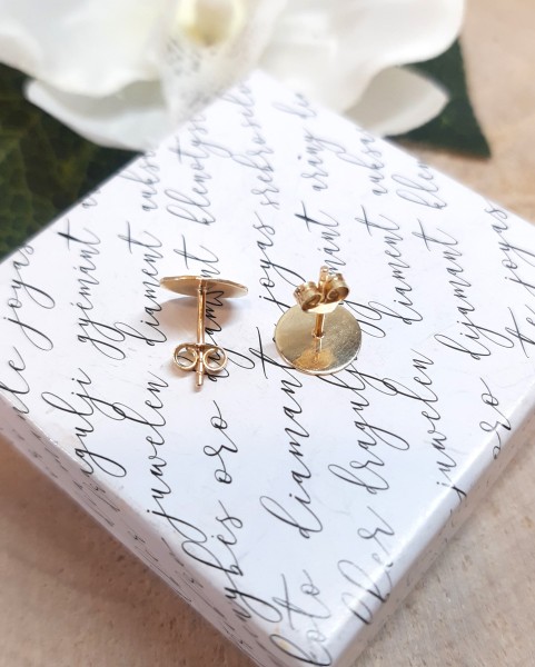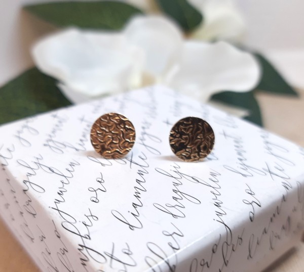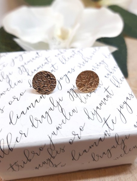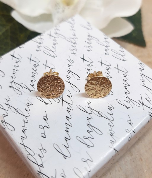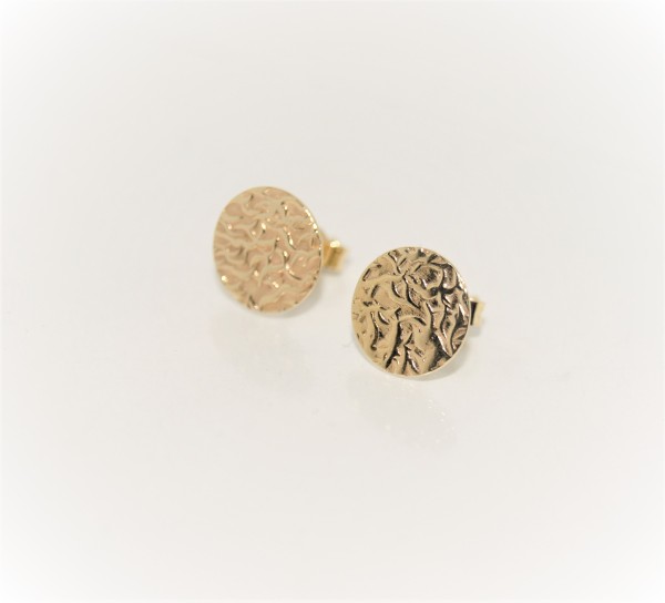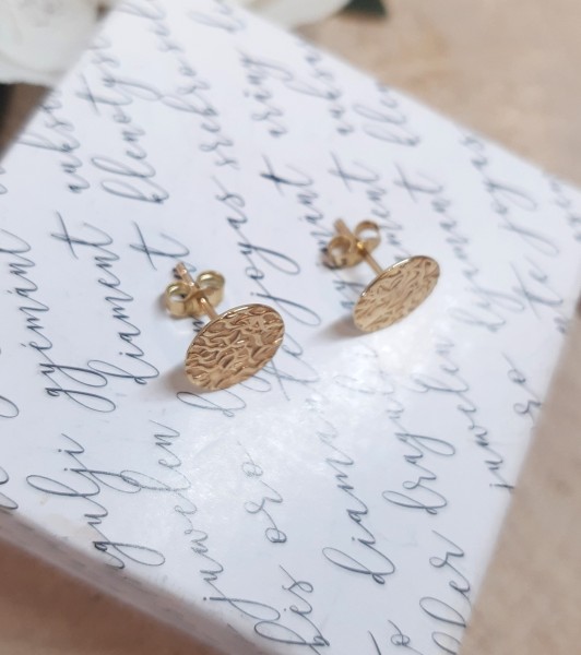 Przedmiotem sprzedaży są kolczyki z zapięciem na sztyfcik, front to okrągła blaszka o nierównomiernej powierzchni, wykonane z 14-karatowego (p.585) żółtego złota.