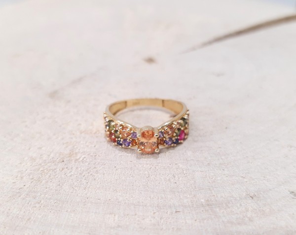 Złoty pierścionek p.585/2,90g z kolorowymi cyrkoniami al.14