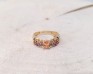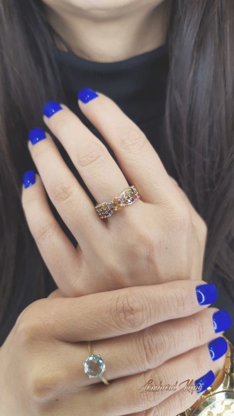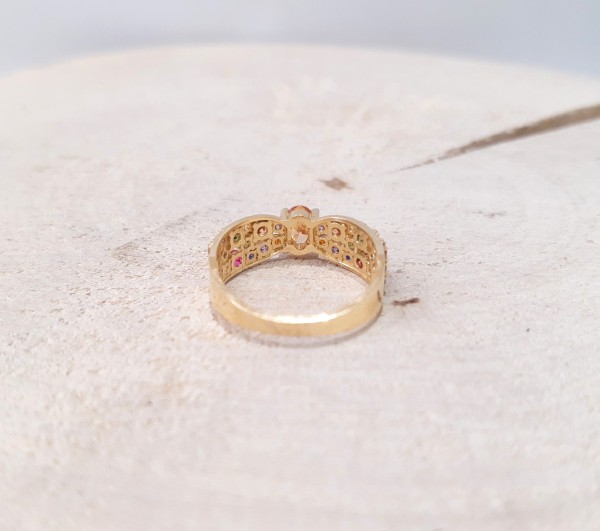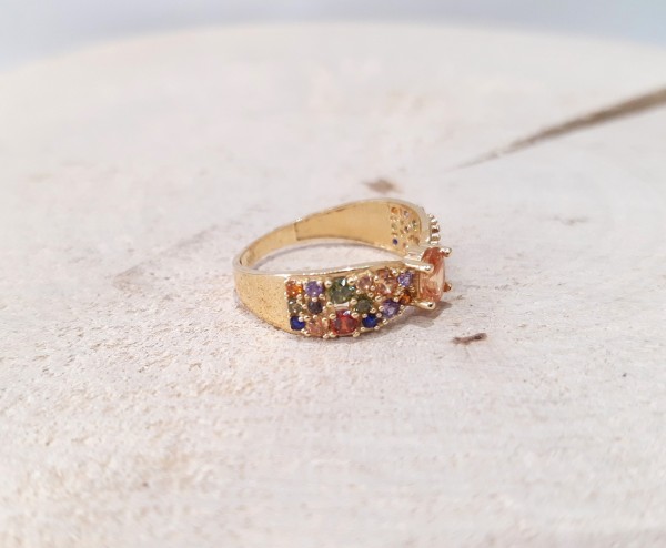 Front pierścionka ozdobiony jest kolrowymi cyrkoniami.