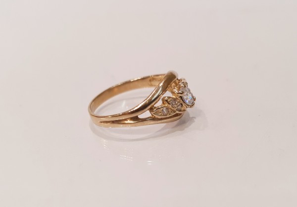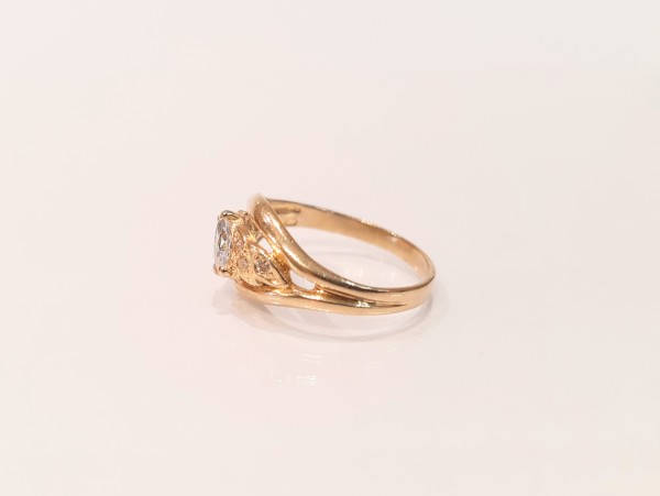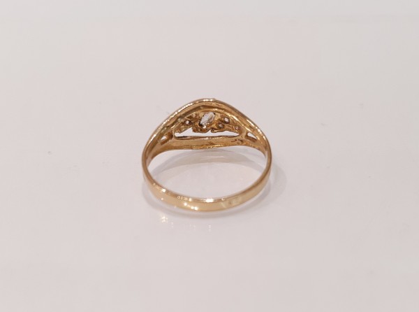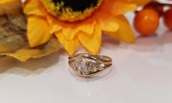 Przedmiotem sprzedaży jest pierścionek z cyrkoniami wykonany z 14-karatowego (p.585), żółtego złota.