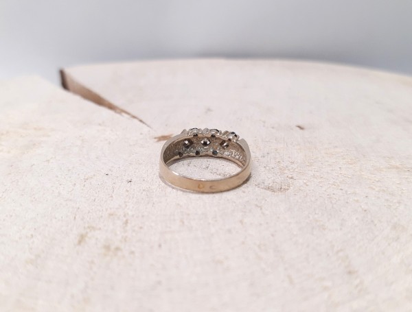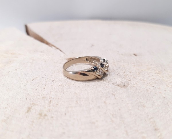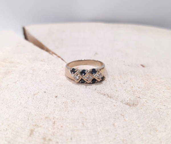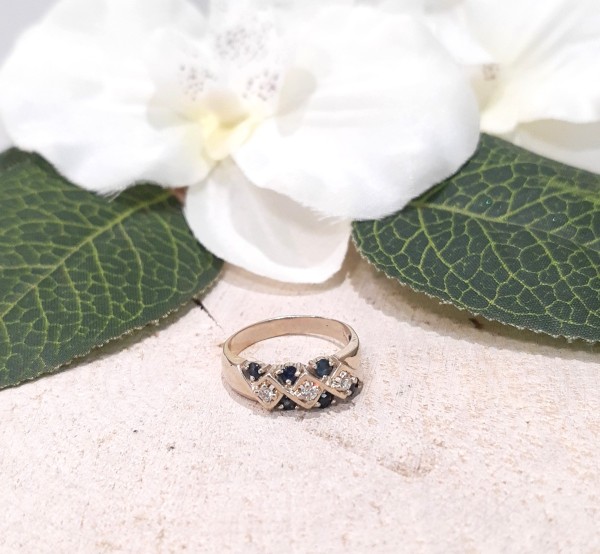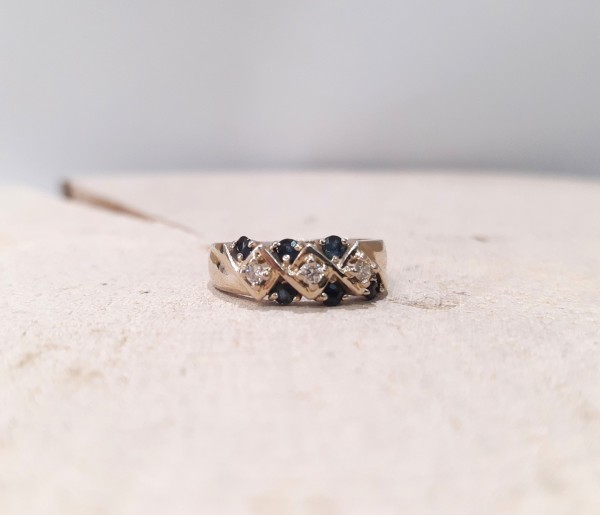 Złoty pierścionek z brylantami i szafirami ~0,12ct. 3,81g/p,585
