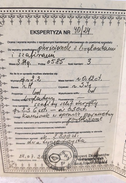 Wyrób oznaczony jest polskimi cechami probierczymi i posiada certyfikat oraz wycenę do obrotu wtórnego.