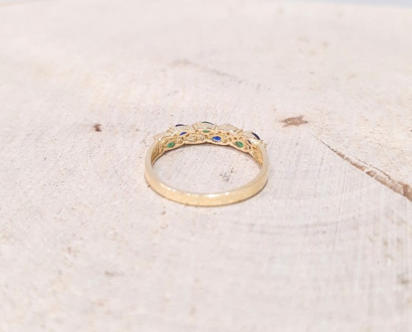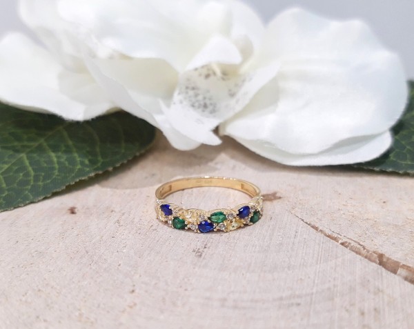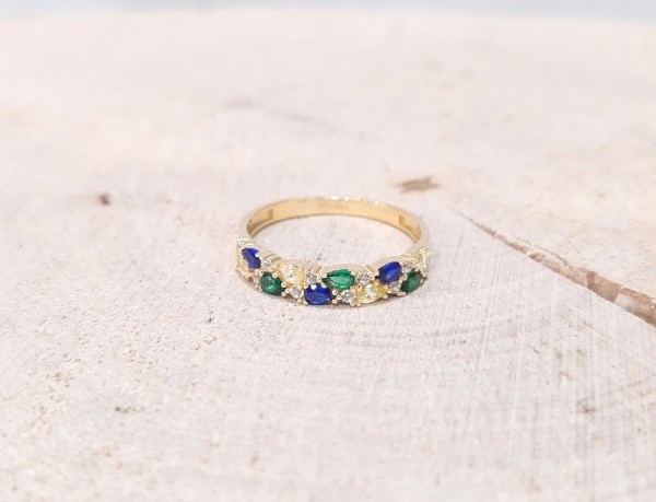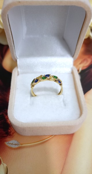 Front pierścionka ozdobiony jest kolrowymi cyrkoniami.