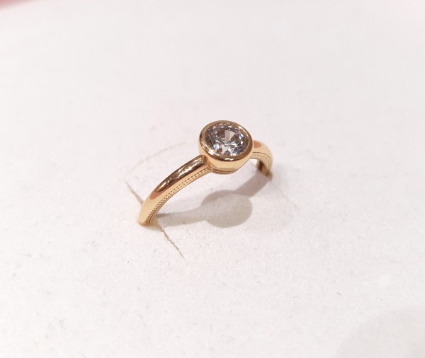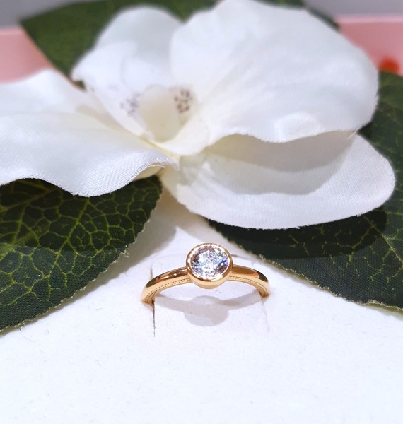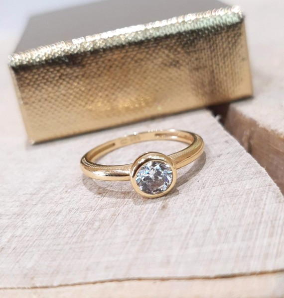 Przedmiotem sprzedaży jest pierścionek z pięknie mieniącą się cyrkonią w kolorze białym, wykonany z 14-karatowego (p.585), żółtego złota.