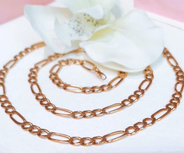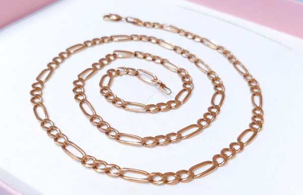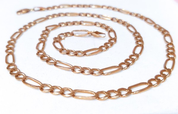 Przedmiotem sprzedaży jest łańcuszek/ splot Figaro, wytrzymały i masywny ,wykonany z 14-karatowego (p.585) różowego złota.