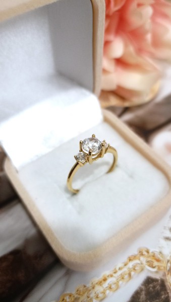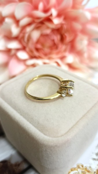 Front ozdobiony jest 1 centralnie osadzoną cyrkonią i dwoma małymi cyrkoniami po bokach obrączki.