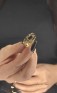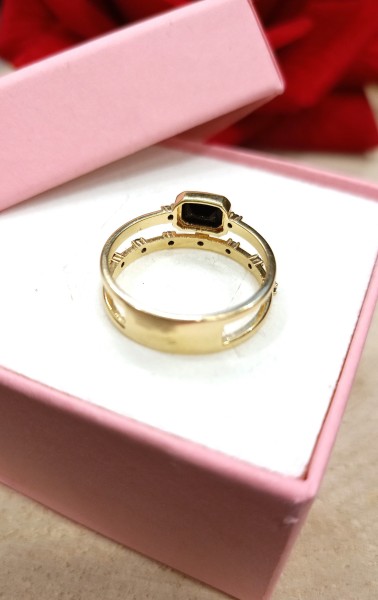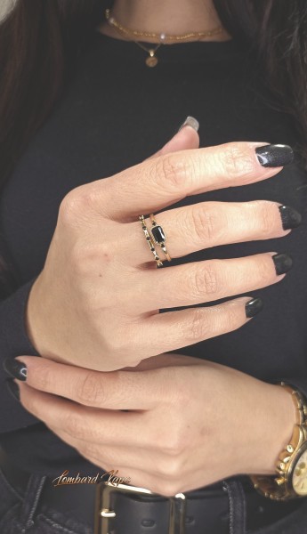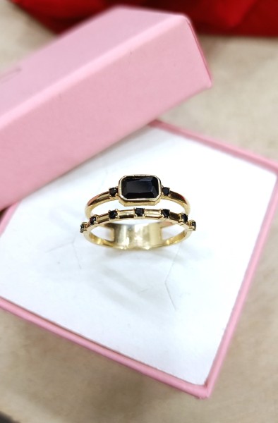 Przedmiotem sprzedaży jest modułowy pierścionek 2w1, wykonany z 14-karatowego (p.585), żółtego złota. Pierścionek zdobi prostokątna, czarna cyrkonia, podobnie jak obrączkę, zdobią maleńkie cyrkonie.