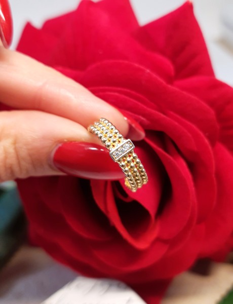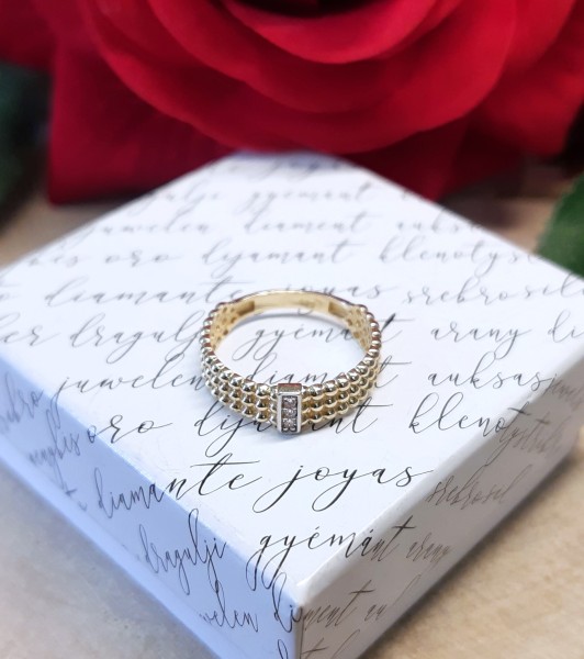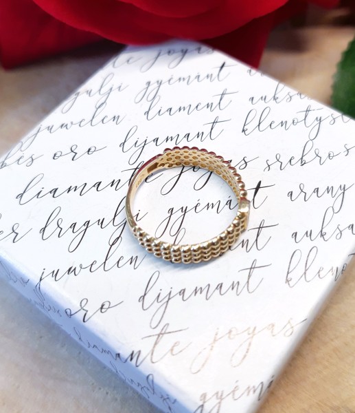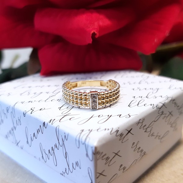 Przedmiotem sprzedaży jest pierścionek a'la obrączka w całości składa się z połaczonych ze sobą kuleczek (tworząc tym samym ażur) wykonany z 14-karatowego (p.585), żółtego złota.