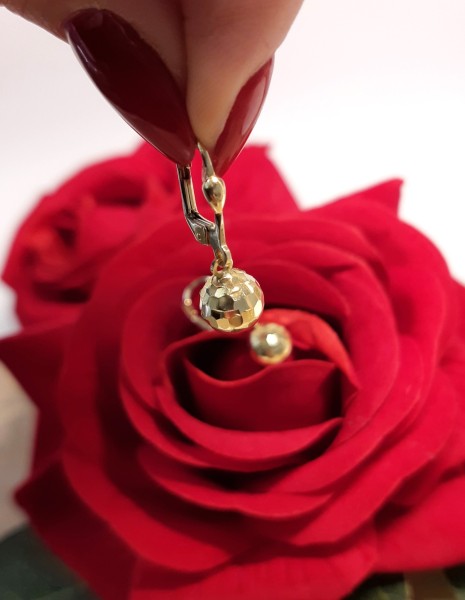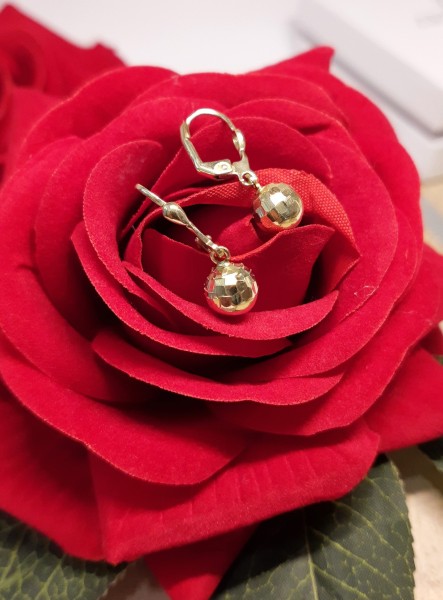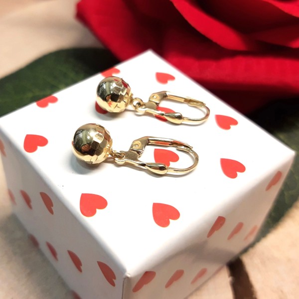 Przedmiotem sprzedaży są złote kolczyki, wiszące kuleczki, lekko ścięte w górnej części - wykonane z 14-karatowego (p.585) żółtego złota.
