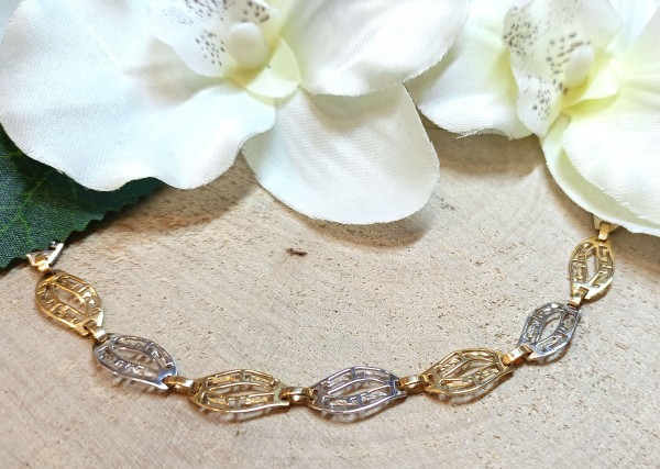 Przedmiotem sprzedaży jest ażurowa bransoletka z motywem greckim, z dwukolorowego złota (białego i żółtego),wykonana z 14-karatowego (p.585) żółtego złota.