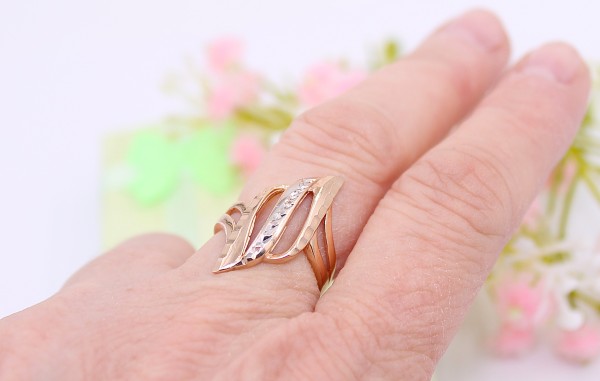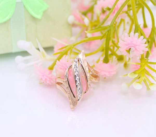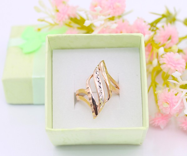 Przedmiotem sprzedaży jest pierścionek z fantazyjnym frontem, wykonany z 14-karatowego, żółtego i białego złota.
