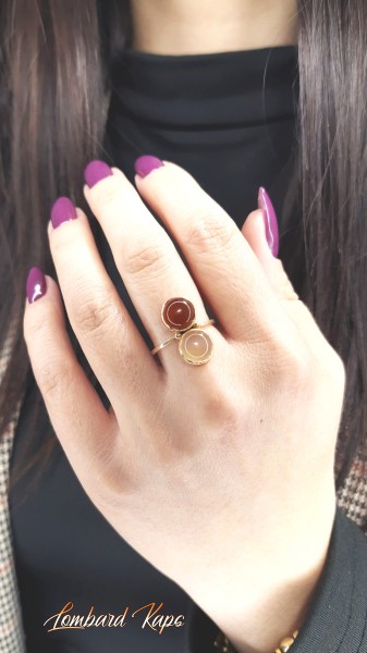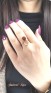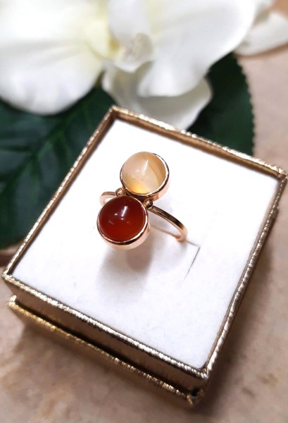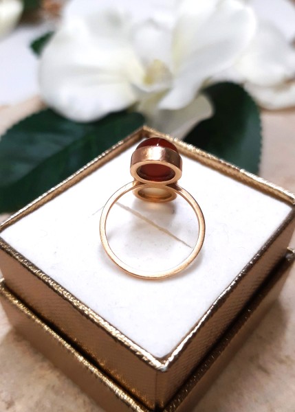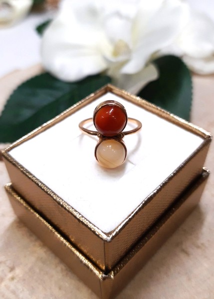 Przedmiotem sprzedaży jest pierścionek z bursztynami, wykonany z 14-karatowego(p.585), różowego złota.