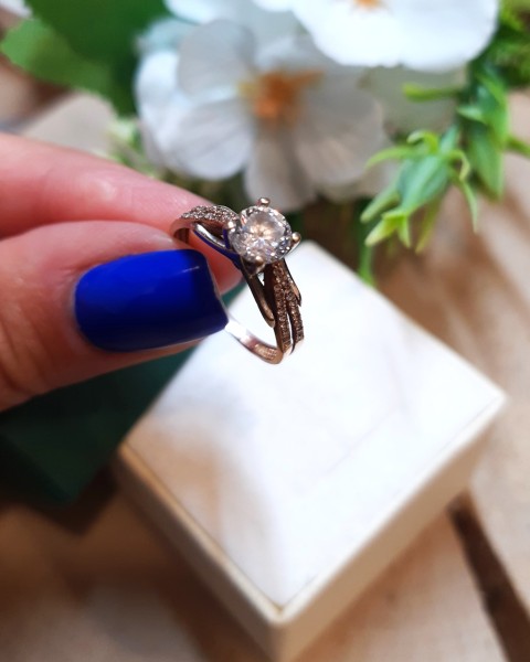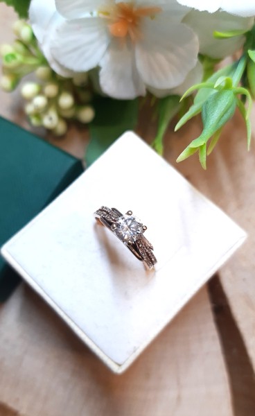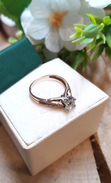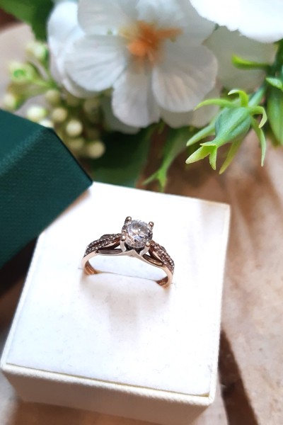 Przedmiotem sprzedaży jest pierścionek z cyrkoniami wykonany z 14-karatowego(p.585), różowego złota.