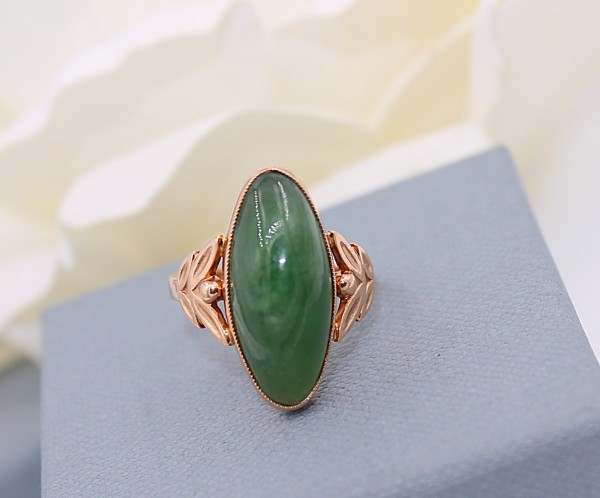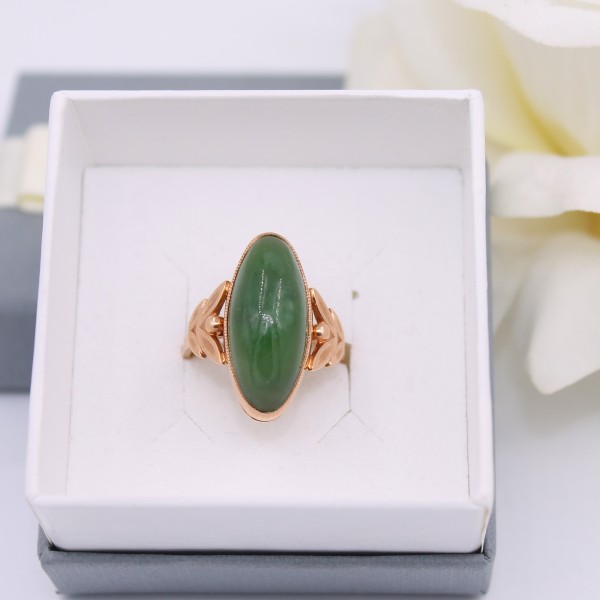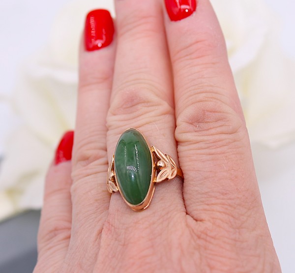 Przedmiotem sprzedaży jest złoty pierścionek wykonany z 14-karatowego (p.585) żółtego złota, ozdobiony zielonym kamieniem.