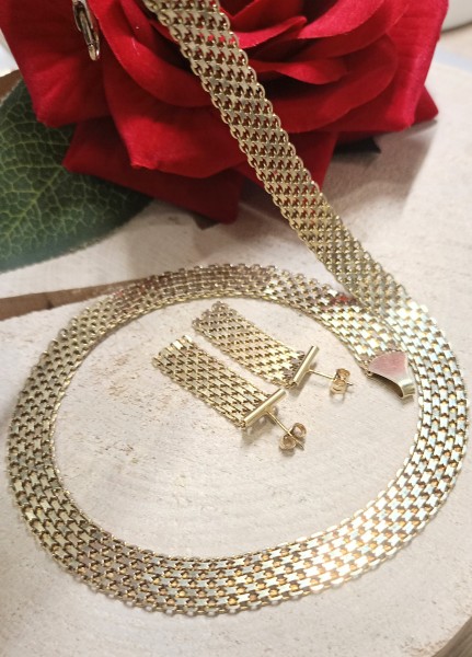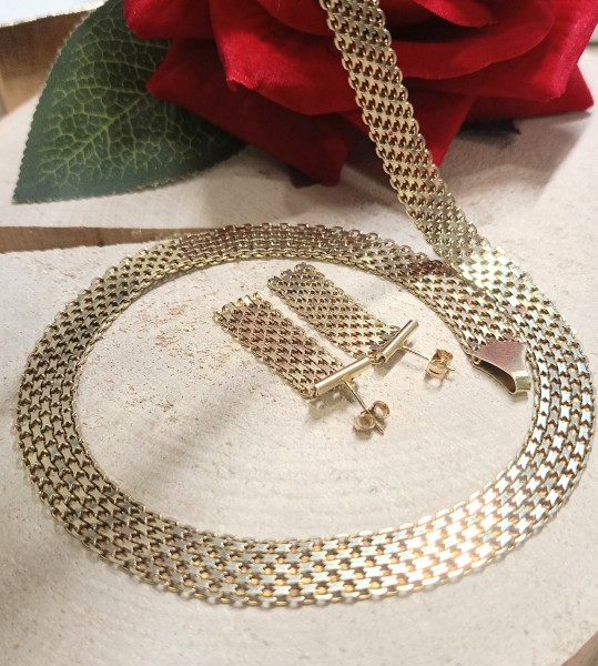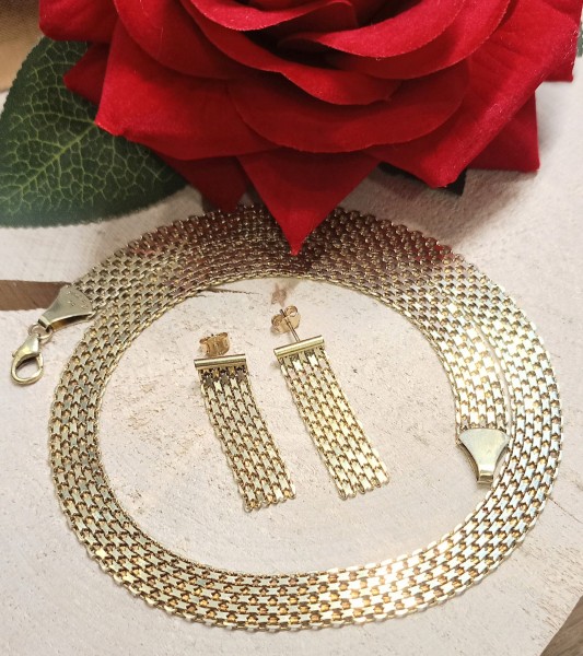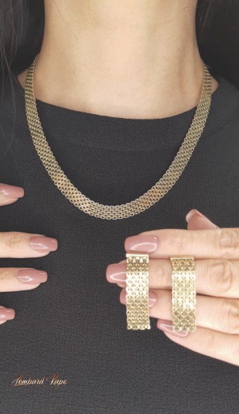 Przedmiotem sprzedaży jest komplet biżuterii naszyjnik z kolczykami wykonany z 14-karatowego (p.585), żółtego złota.