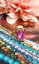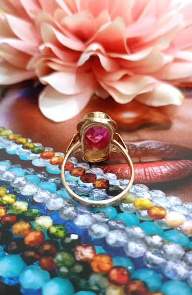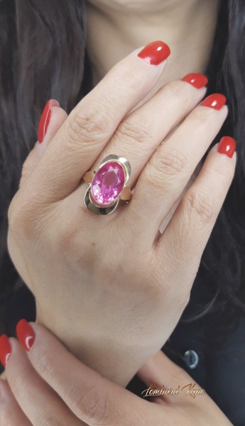 Przedmiotem sprzedaży jest pierścionek z różowym kamieniem, wykonany z 14-karatowego (p.583),różowego złota.