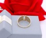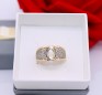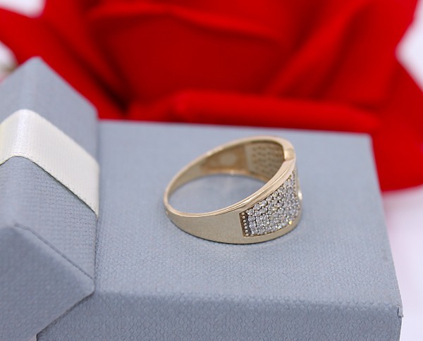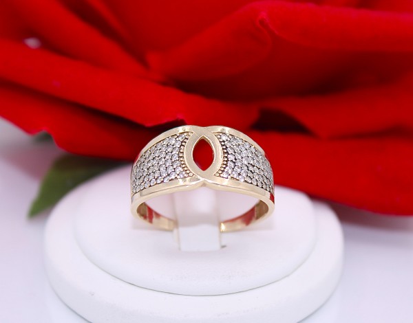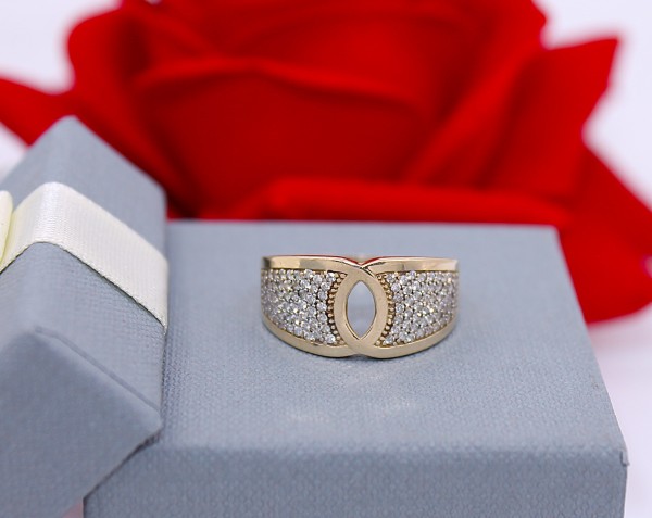 Przedmiotem sprzedaży jest pierścionek wykonany z 14-karatowego(p.585),żółtego złota, ozdobiony na froncie cyrkoniami.