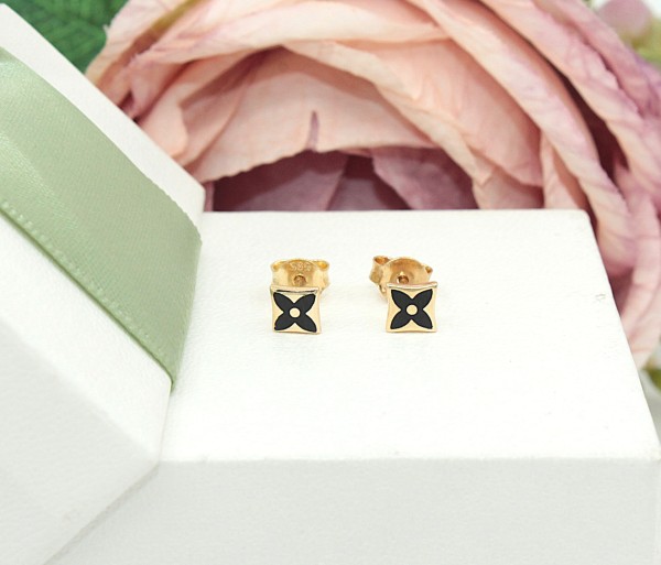 Złote kolczyki p.585/0,78g, wkrętki z czarnym kwiatuszkiem ŁS