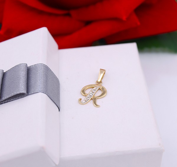 Przedmiotem sprzedaży jest zawieszka - literka "R"ozdobiona cyrkoniami - wykonana z 14-karatowego (p.585),żółtego złota.