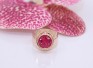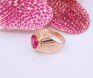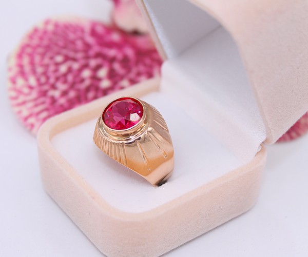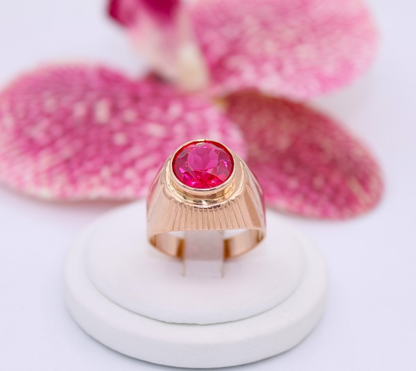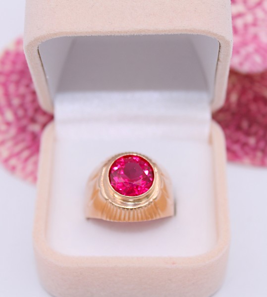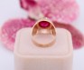 Przedmiotem sprzedaży jest sygnet wykonany z 14-karatowego(p.585),różówego złota, ozdobiony na froncie malinowym kamieniem.