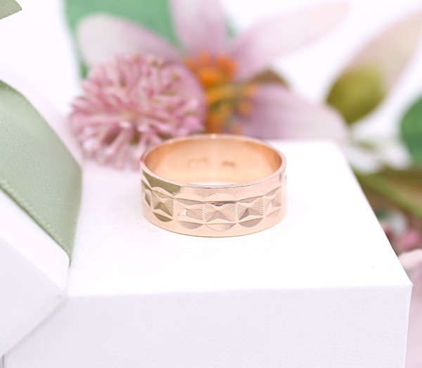 Przedmiotem sprzedaży jest grawerowana obrączka, wykonana z 14-karatowego (p.585), różowego złota.