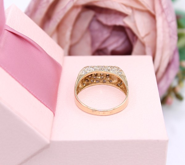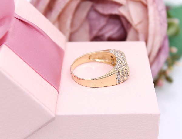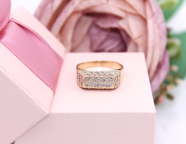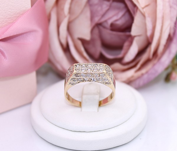 Przedmiotem sprzedaży jest pierścionek, wykonany z 14-karatowego (p.585), żółtego złota, wysadzany cyrkoniami na froncie.