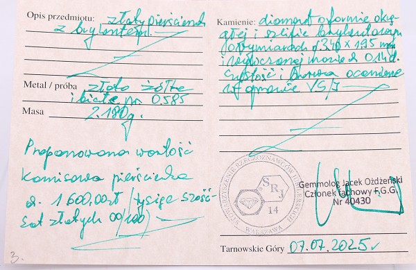 Wyrób oznaczony jest polskimi cechami probierczymi i posiada certyfikat oraz wycenę do obrotu wtórnego.