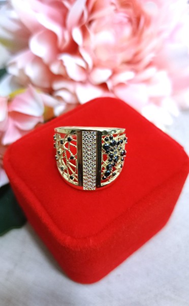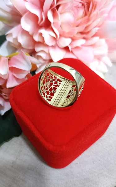Przedmiotem sprzedaży jest pierścionek z szerokim, ażurowym frontem, zdobionym cyrkoniami, wykonany z 14-karatowego (p.585), żółtego złota.