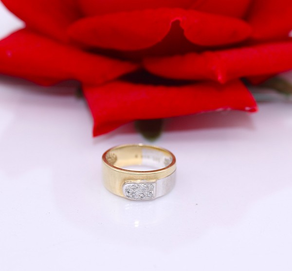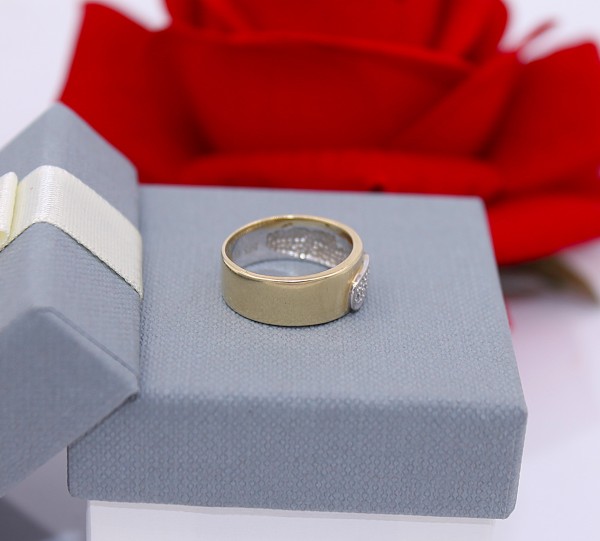 Przedmiotem sprzedaży jest pierścionek wykonany z 14 karatowego(p.585),żółtego i białego złota z drobnymi brylancikami na froncie.