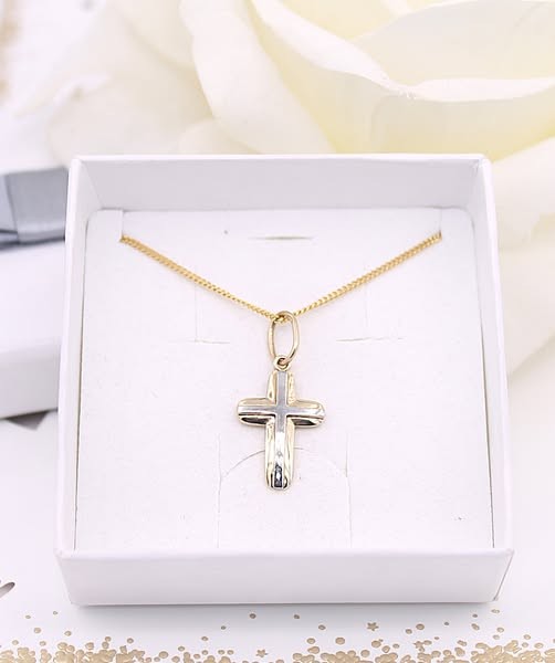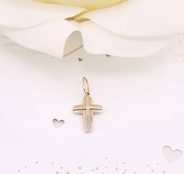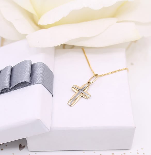 Przedmiotem sprzedaży jest zawieszka - Krzyż, wykonana z 14-karatowego (p.585), żółtego i białego złota.
