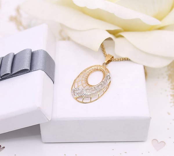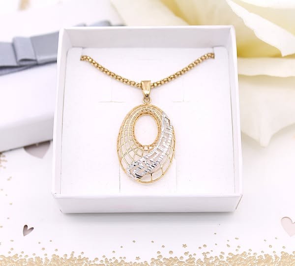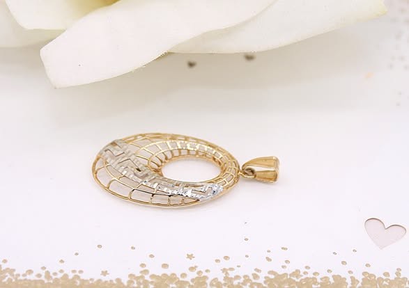 Przedmiotem sprzedaży jest zawieszka - ażurowa z greckim wzorem, wykonana z 14-karatowego (p.585), żółtego i białego złota.