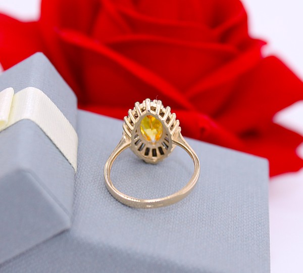 Przedmiotem sprzedaży jest pierścionek wykonany z 14-karatowego (p.585), żółtego złota - ozdobiony na froncie żółtymi i czarnymi kamieniami.