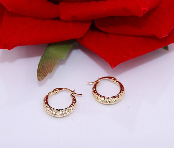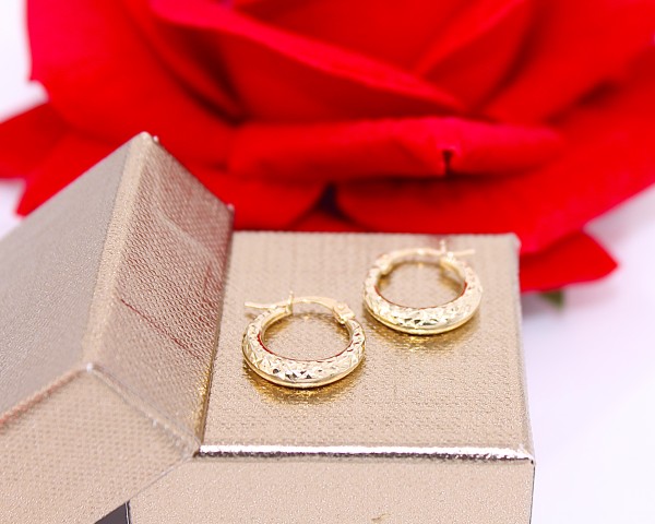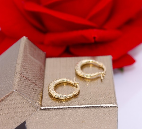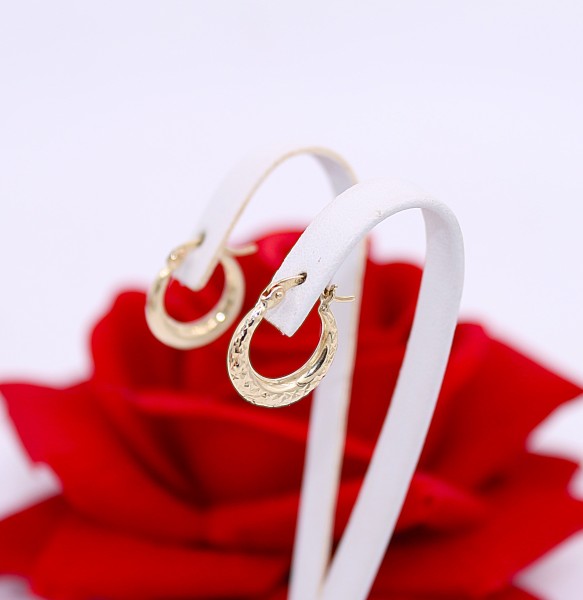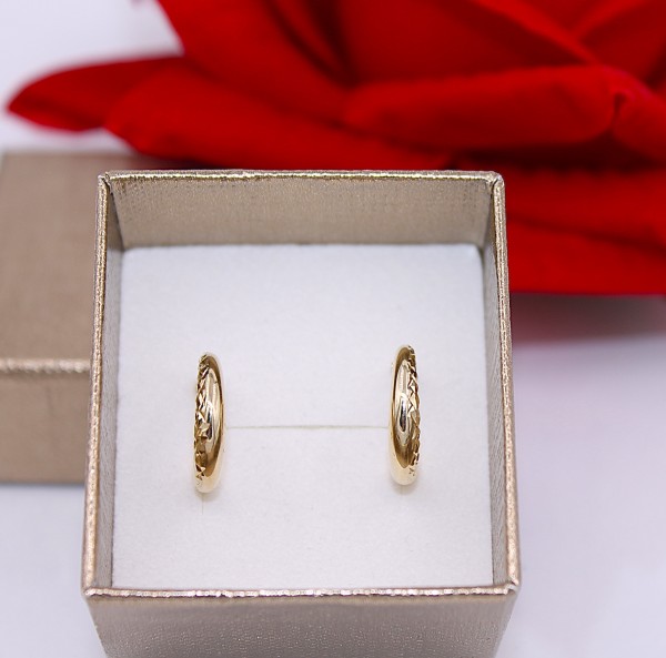 Przedmiotem sprzedaży są złote kolczyki, wykonane z 14-karatowego (p.585) żółtego złota - grawerowane.