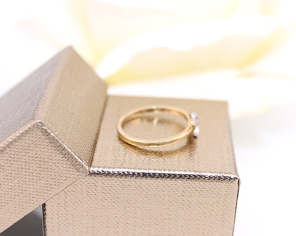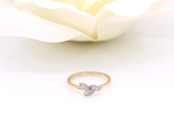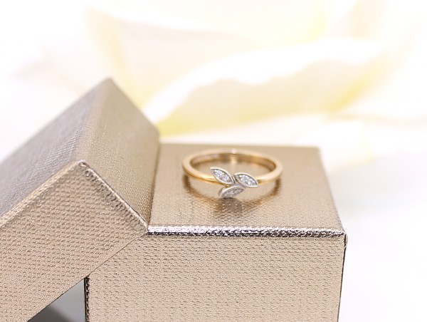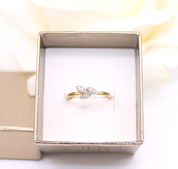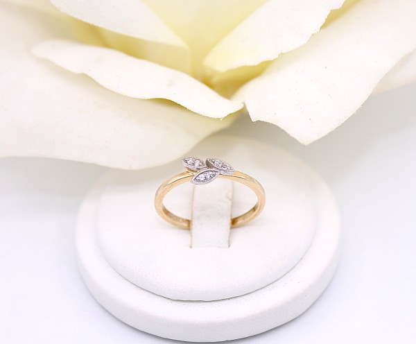 Przedmiotem sprzedaży jest pierścionek - ozdobiony na froncie listkami i cyrkoniami, wykonany z 14-karatowego(p.585), żółtego i białego złota.