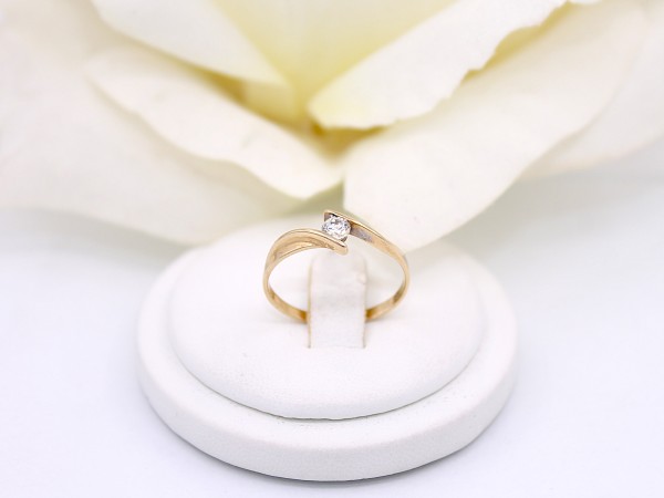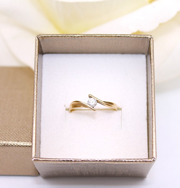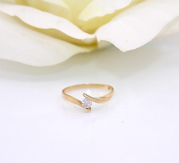 Przedmiotem sprzedaży jest pierścionek - ozdobiony na froncie cyrkonią, wykonany z 14-karatowego(p.585), żółtego złota.