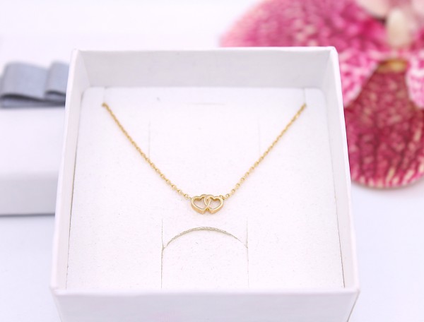 Przedmiotem sprzedaży jest łańcuszek-celebrytka z dwoma serduszkami, wykonany z 14-karatowego (p.585), żółtego złota.