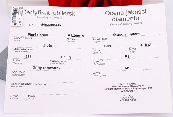 Złoty pierścionek p.585/1,50g z brylantem ŁS