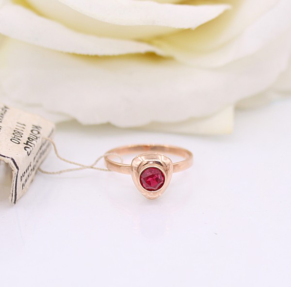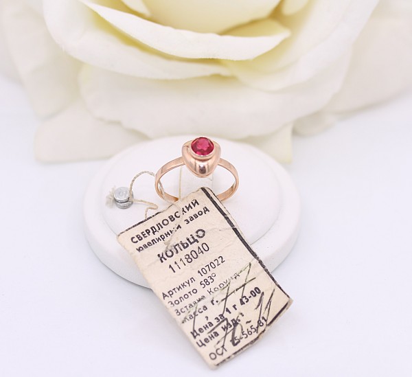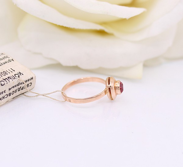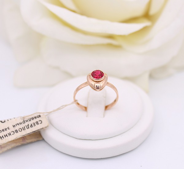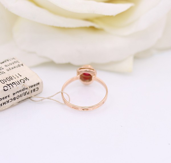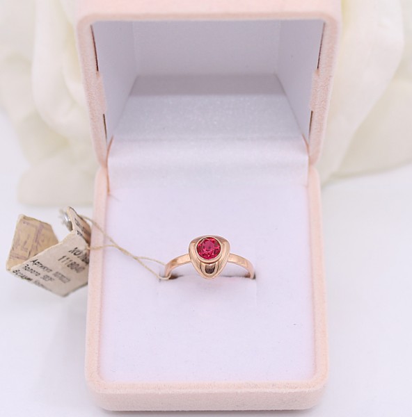 Przedmiotem sprzedaży jest pierścionek - ozdobiony na froncie różówym kamieniem, wykonany z 14-karatowego(p.585), różowego złota.