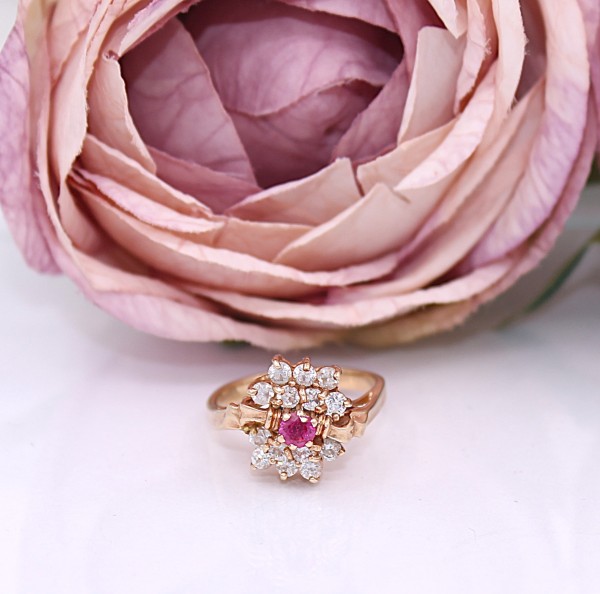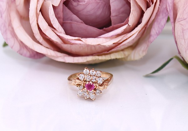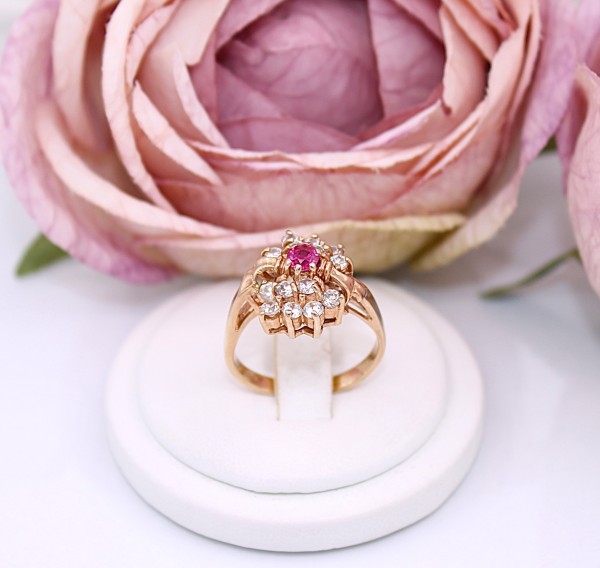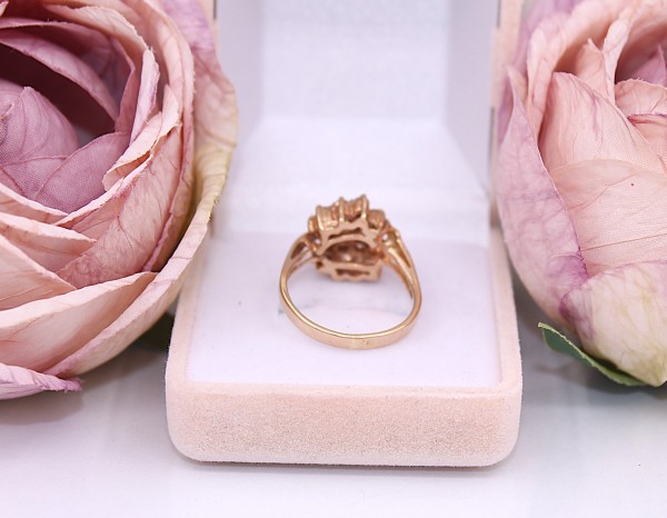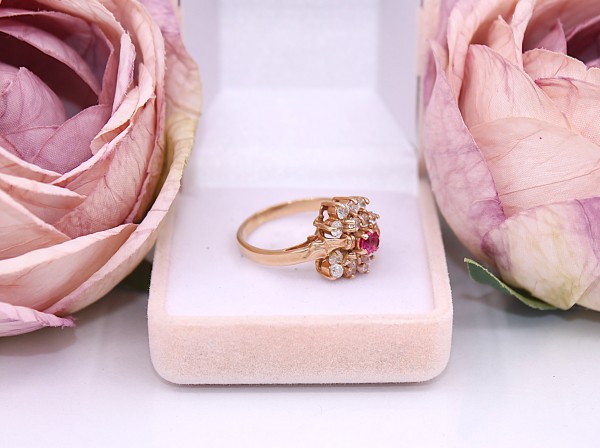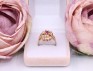 Przedmiotem sprzedaży jest pierścionek, wykonany z 14-karatowego, różowego złota, ozdobiony na froncie różowym kamieniem i cyrkoniami.