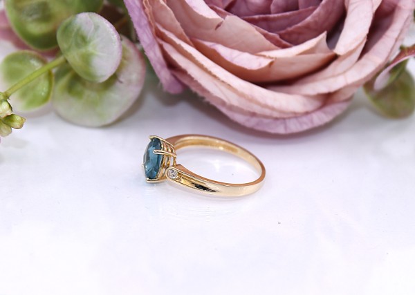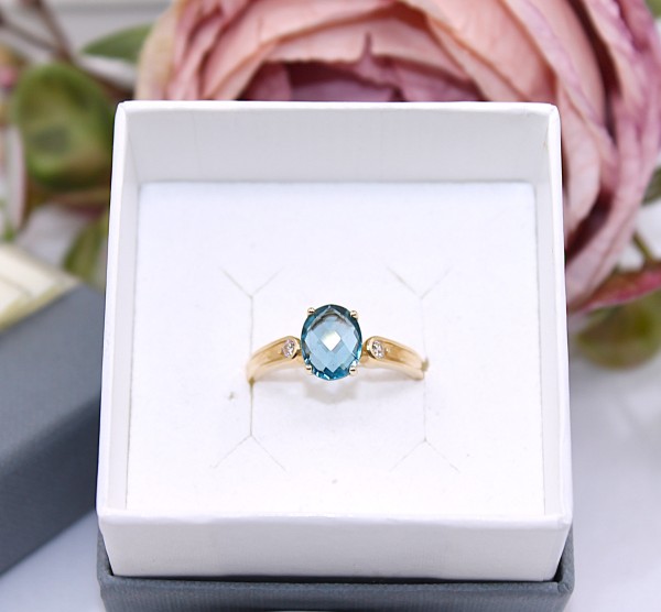 Przedmiotem sprzedaży jest pierścionek, wykonany z 14-karatowego (p.585), żółtego złota z niebieskim kamieniem i cyrkoniami.