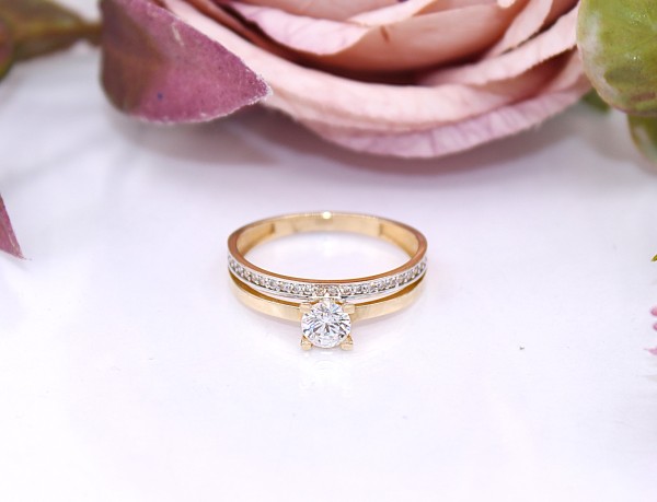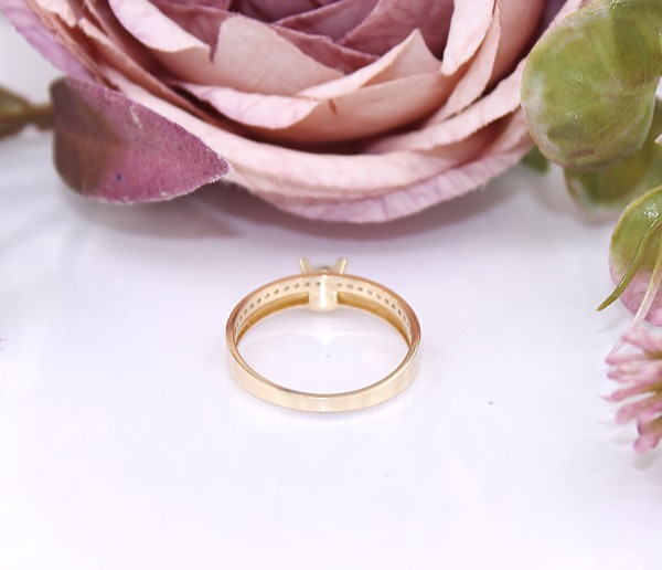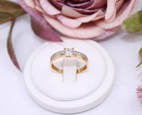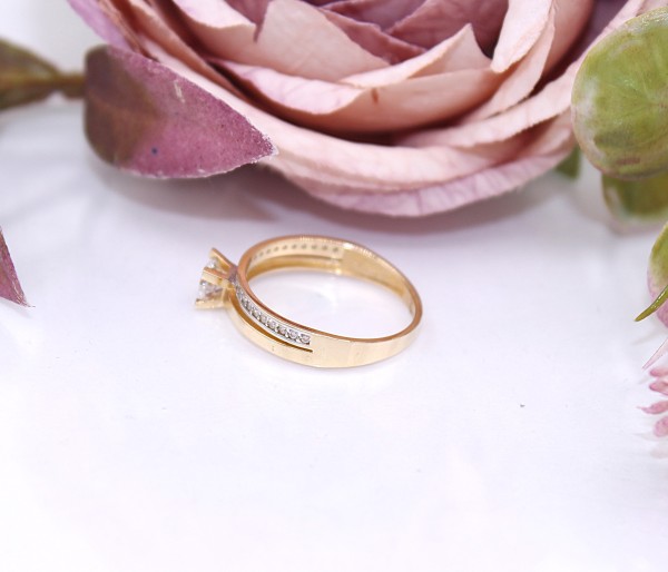Przedmiotem sprzedaży jest pierścionek, wykonany z 14-karatowego (p.585), żółtego złota z cyrkoniami.