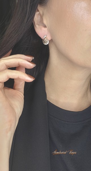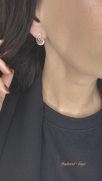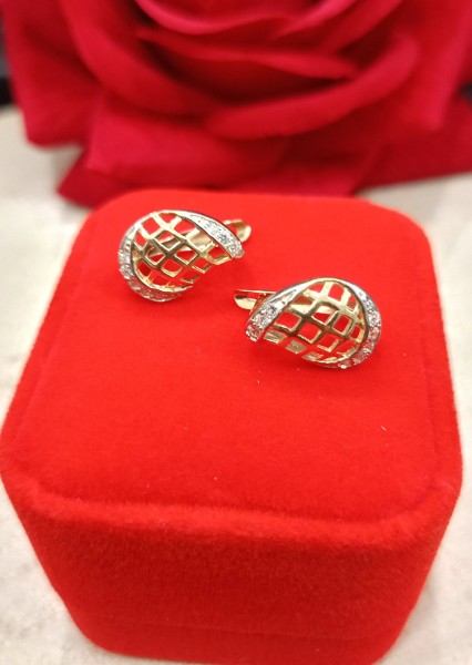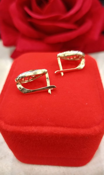 rzedmiotem sprzedaży są złote,ażurowe kolczyki zdobione cyrkoniami ,wykonane z 14-karatowego (p.585) żółtego złota.