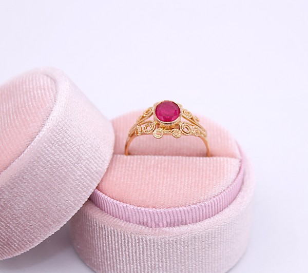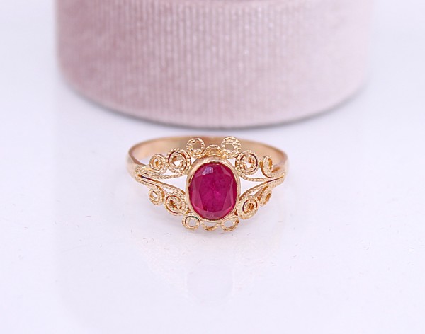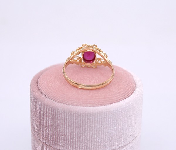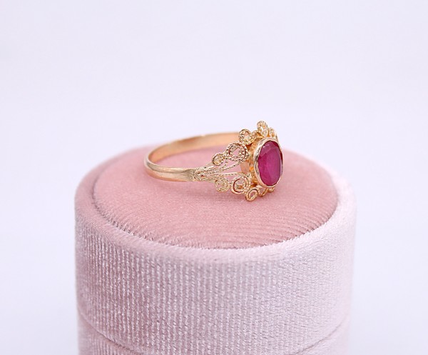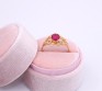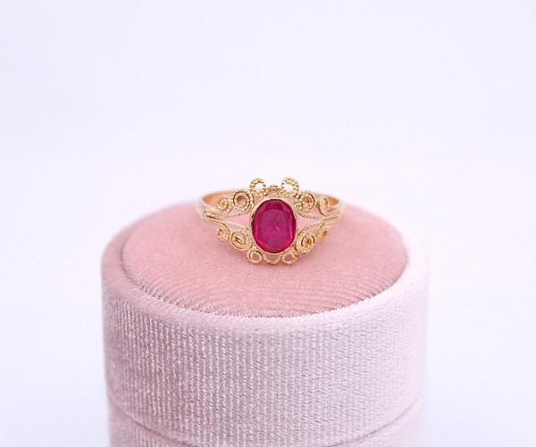 Przedmiotem sprzedaży jest pierścionek z różowym kamieniem, wykonany z 14-karatowego (p.585),żółtego złota.