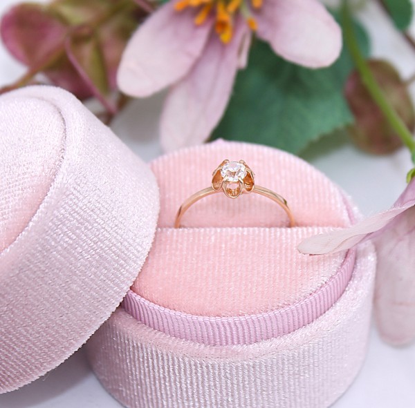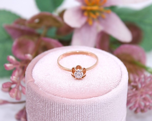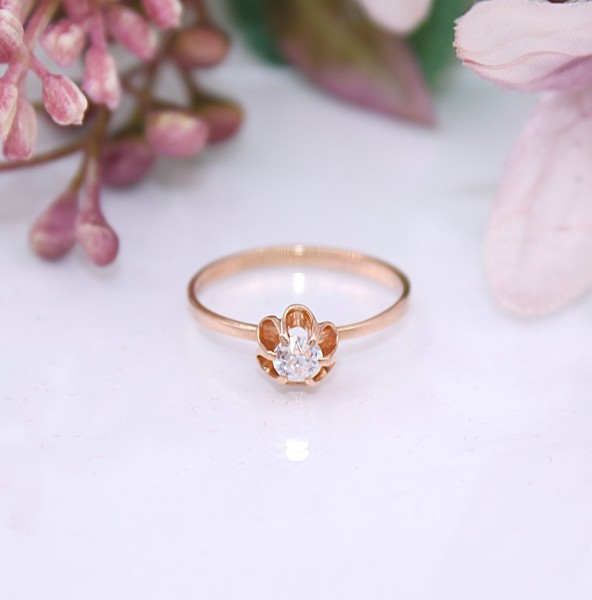 Przedmiotem sprzedaży jest pierścionek z cyrkonią, wykonany z 14-karatowego(p.585), różowego złota.