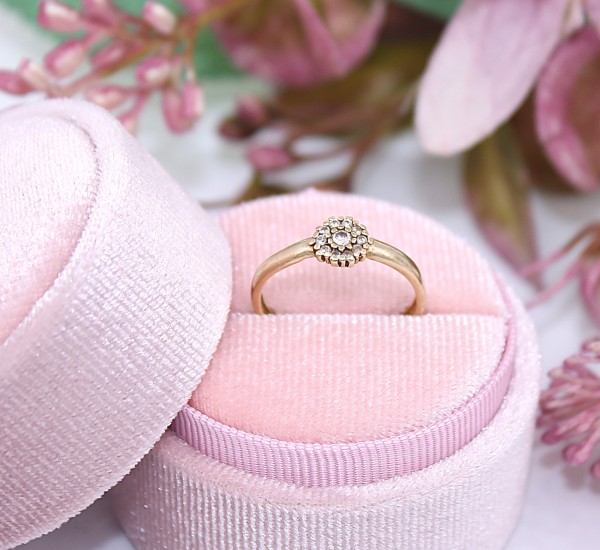 Przedmiotem sprzedaży jest pierścionek wykonany z 14-karatowego(p.585),żółtego złota, ozdobiony na froncie cyrkoniami.