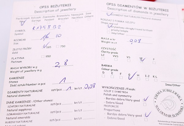 Wyrób oznaczony jest polskimi cechami probierczymi i posiada certyfikat oraz wycenę do obrotu wtórnego.