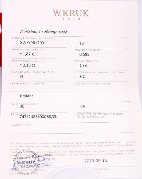 Wyrób oznaczony jest polskimi cechami probierczymi i posiada certyfikat oraz wycenę do obrotu wtórnego.