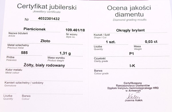 Wyrób oznaczony jest polskimi cechami probierczymi i posiada certyfikat oraz wycenę do obrotu wtórnego.